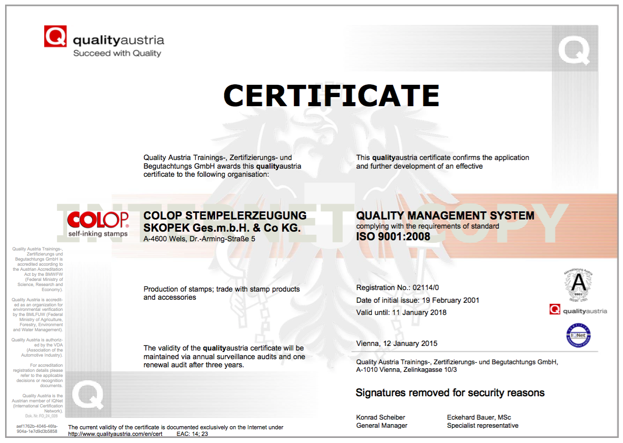 Colop - Сертификаты
