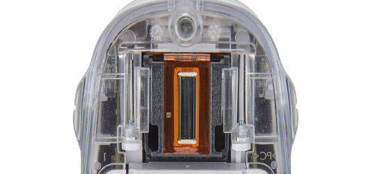| Печатающая головка Печатающая головка встроена в картридж и видна на нижней стороне электронной метки. |