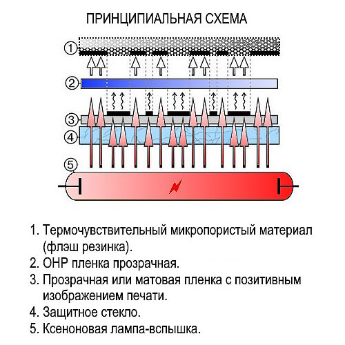 Поверхностный слой резины, имеющей серый цвет, нагревается за счет поглощения света лампы-вспышки. При этом происходит выборочное спекание пор. Под воздействием светового импульса спекаются поры поверхности резины. В местах, защищённых от попадания света, поры остаются открытыми-серыми . В последствии, через открытые поры будет просачиваться штемпельная краска, образуя оттиск рисунка на поверхности. Таким образом создается не печатающая часть печати, не пропускающая чернила-она станет чёрного цвета.